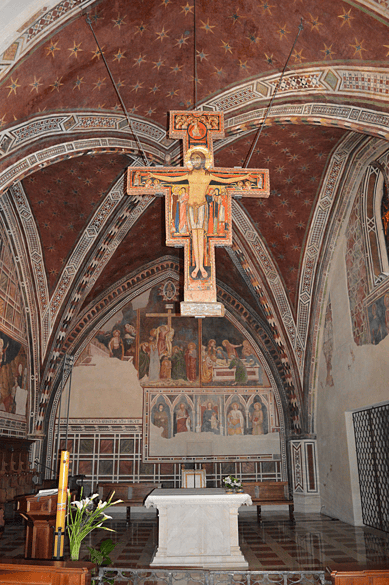 Një ditë, derisa Françesku lutej para kryqit të Krishtit në kishën e shën Damjanit afër Asizit, dëgjoi prej kryqit një zë që i tha: “Shko, Françesk, e rindërtoje shtëpinë time, e cila – siç po e sheh – është duke u rrëzuar!” Me të vërtetë, kisha e shën Damjanit ishte e vjetër dhe shumë e dëmtuar. Prandaj Françesku kuptoi se ishte fjala për atë kishë. (Vetëm disa vjet më vonë ai do të kuptojë se thirrja e tij ishte ripërtëritja e Kishës së gjallë, e bashkësisë së besimtarëve.)