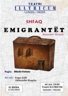 Të dielën më 17.03.2019 në ora 18:00 në Teatrin ILLYRICUM - Gjuhadol në Shkodër që është pjesë e Provincës Françeskane Shqiptare, nën regjinë e Nikolin Ferketa u shfaq "Emigrantët" të autorit Sławomir Mrożek. Kjo shfaqje flet për ekzistencën dhe vështirësitë e emigrantëve që jetojnë në vende të ndryshme.